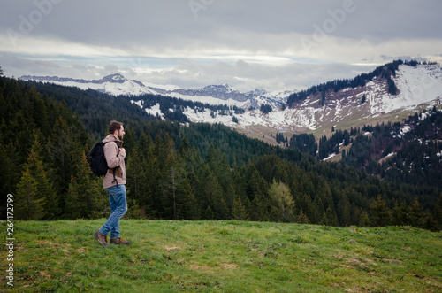 © Dominic, Naklejka premium man walking with backpack in the mountains