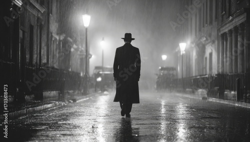 Naklejka premium Man walks rainy city street, night, film noir background, mystery