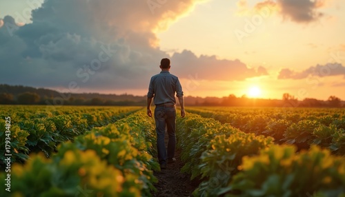 Obraz premium Man walks through field at sunset. Farmer inspects sugar beet crop. Rows of plants stretch into distance. Agriculture worker monitors growth at golden hour. Field inspection, agronomy.