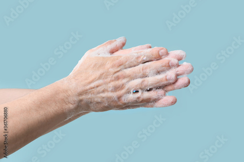© Pixel-Shot, Fototapeta premium Man washing hands with soap on color background