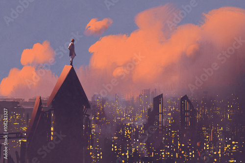 © grandfailure, Naklejka premium man watching over the city,illustration painting