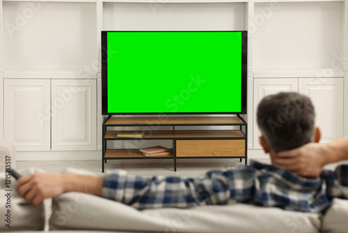 © New Africa, Fototapeta premium Man watching TV on sofa at home, back view