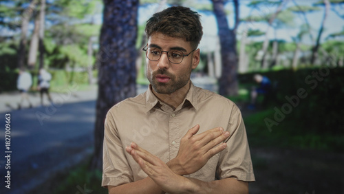 Fototapeta premium Man wearing beige shirt crossing arms in green park on sunny walkway under tall pine trees; denial frustration.