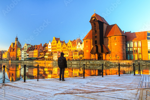© nkarol, Fototapeta premium Man wearing black warm dawn jacket standing in full length on