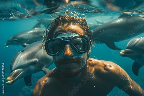 Naklejka premium Man Wearing Diving Mask Surrounded by Dolphins Underwater