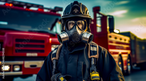 Naklejka premium Man wearing gas mask standing in front of firetruck.