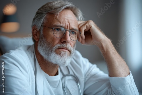 Fototapeta premium Man wearing glasses rests his head on his hand. He is looking forward thoughtfully. White lab coat and stethoscope are visible. Soft lighting.