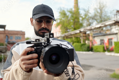 © pressmaster, Obraz premium Man wearing hat and glasses holding professional camera while standing outdoors, adjusting settings with focused expression, blurry background of buildings and trees adding depth