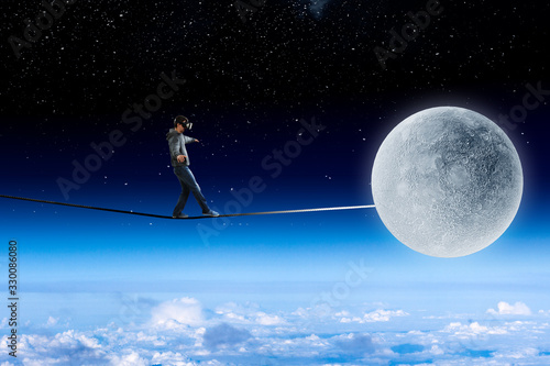 © Sergey Nivens, Obraz premium Man wearing virtual reality goggles and balancing on rope