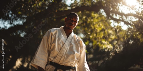 © Yauheniya, Fototapeta premium Man Wearing White Kimono with Black Belt in Traditional Martial Arts Pose
