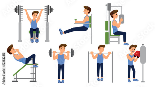 Naklejka premium Man who is liking sport doing fitness. Healthy life and regular sports concept. Fitness set in sequence. Ways of life and different types of sports.