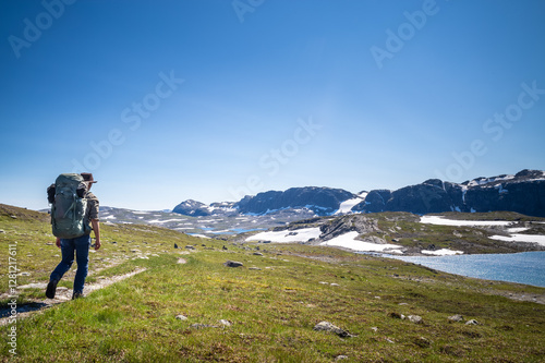 Fototapeta premium Man with a backpack hiking in a mountain area