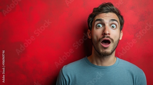 © Nataliia_Trushchenko, Fototapeta premium Man with a beard and a blue shirt is looking at the camera with his mouth open, standing in front of a red wall. a man with a funny, shocked facial expression on a red background with rays behind him.