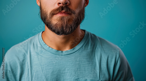 © Алла Морозова, Fototapeta premium Man with a beard and mustache is wearing a blue shirt