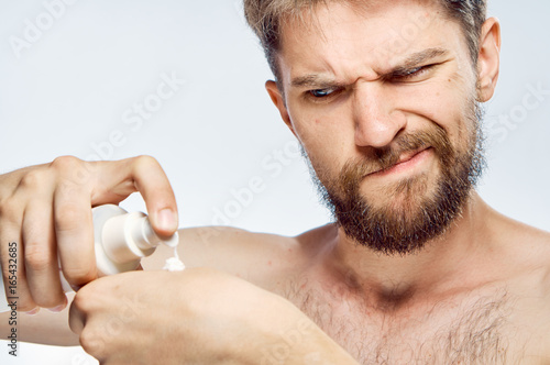 Obraz premium Man with a beard on white isolated background applies cosmetic cream