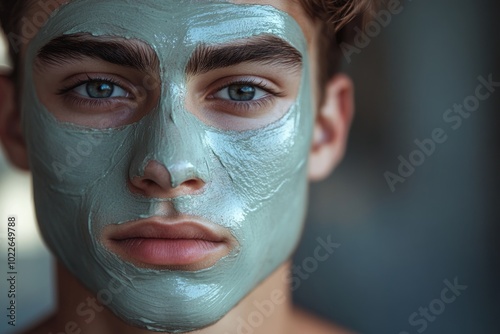 © Trushchenko_O, Fototapeta premium Man with a green face mask on. The man has a serious look on his face