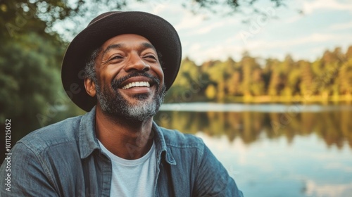 Obraz premium Man with a hat smiling by the lake on a sunny day