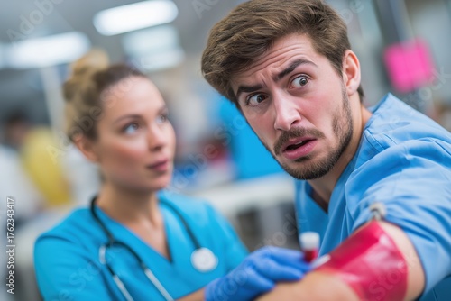 Obraz premium Man with a terrified expression looking at the needle during a blood test