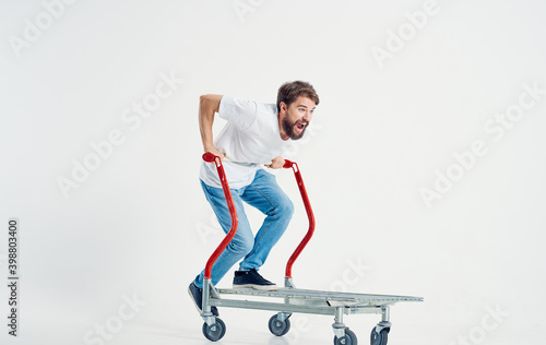 Obraz premium man with a trolley in his hand on a light background transporting heavy objects