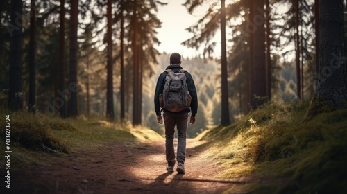 © kardaska, Obraz premium Man with backpack is walking along a forest path