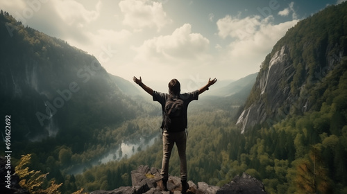 © Gayan, Obraz premium Man with backpack raising arms in joy amidst misty mountains, expressing freedom and adventure.