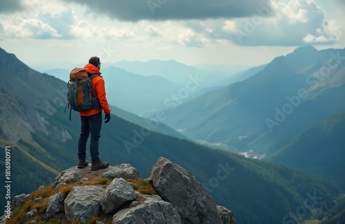 © Pete, Fototapeta premium Man with backpack stands on rocky mountain summit looking over vast blue hills. Hiker wears orange jacket, enjoys expansive landscape view after climbing. Peaceful nature scene with distant valley.