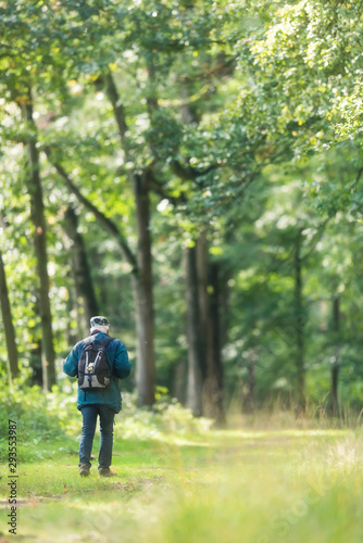 © ysbrandcosijn, Fototapeta premium Man with backpack walking on sunny forest path in early fall.