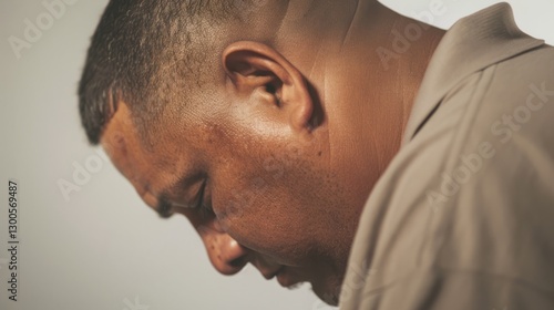 Obraz premium Man with bald head, turned downwards, looking intently at something below him.