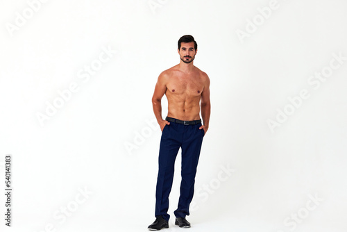 Fototapeta premium Man with bare torso and prue cubes in business pants shows full-length nude...