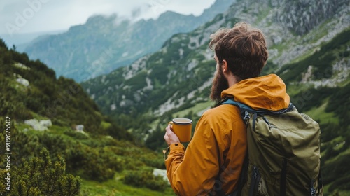 Naklejka premium Man with beard hiking in mountains, holding a coffee cup. Adventure and...