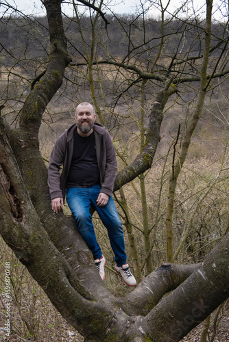 Naklejka premium Man with beard seats on old big tree