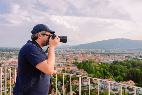 © Roman Babakin, Obraz premium Man with camera taking photos of Maribor Slovenia