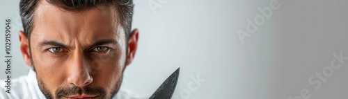 © Withun, Obraz premium Man with chef's knife, white background, cooking tool