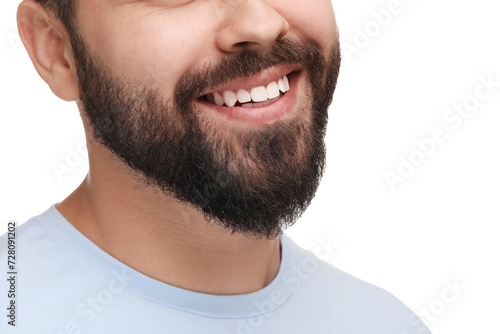 Obraz premium Man with clean teeth smiling on white background, closeup
