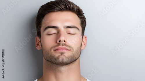 Obraz premium Man with closed eyes appears relaxed against neutral background, showcasing...