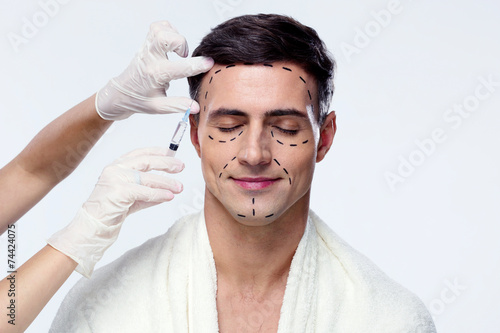 Obraz premium Man with closed eyes at plastic surgery with syringe in his face