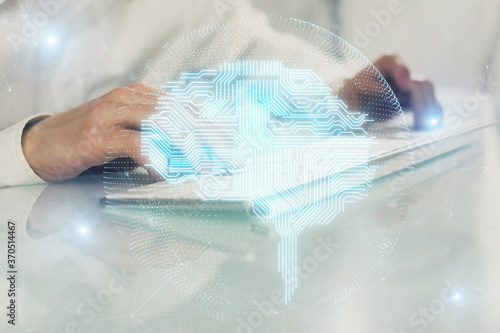 Fototapeta premium Man with computer background with brain theme hologram. Concept of brainstorm. Double exposure.