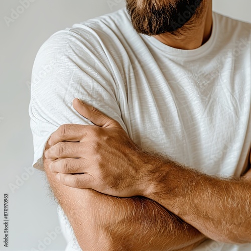 Fototapeta premium Man with crossed arms in white shirt beard strong confident attitude folded muscular arms concept
