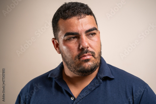 © Nexa, Obraz premium Man with dark hair and beard looking to the side with serious expression on pastel background.