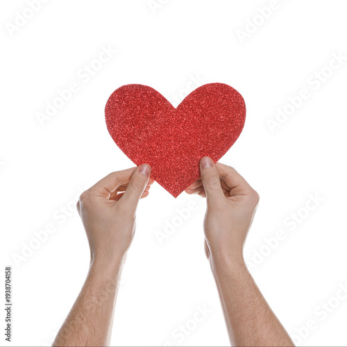 © New Africa, Fototapeta premium Man with decorative heart on white background, closeup
