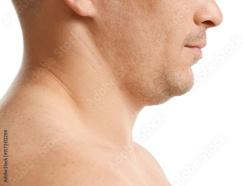 © New Africa, Obraz premium Man with double chin on white background, closeup