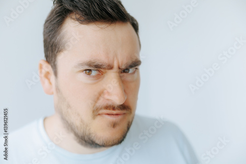 © Alexandr, Fototapeta premium Man with expressive frown reacts in confusion against neutral background