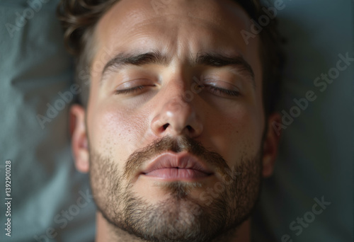 © Ahapen, Fototapeta premium Man with eyes closed closeup. Young man with concentrated face expression, meditating and taking a deep breath. No stress concept
