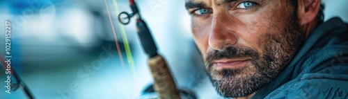 © Katavudh, Fototapeta premium Man with fishing reel, white background, angling equipment