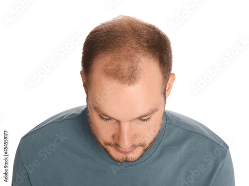 Obraz premium Man with hair loss problem isolated on white, above view. Trichology treatment