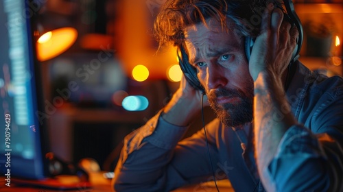 © Sippung, Obraz premium Man with headphones looking at computer screen