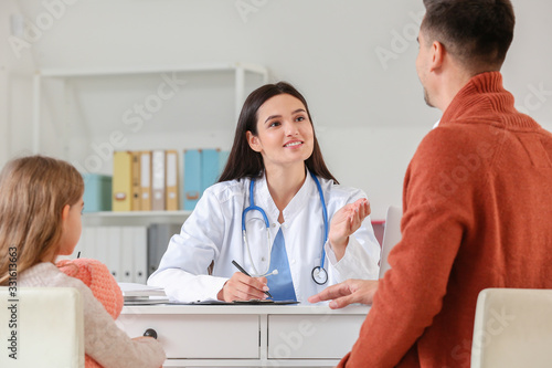 Fototapeta premium Man with little daughter visiting pediatrician in clinic