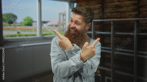 Naklejka premium Man with long ginger beard pointing both index fingers to the side in bright...