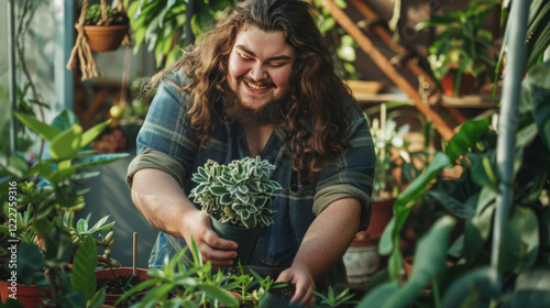 © ArtShop, Fototapeta premium Man with long hair is holding a plant in his hand