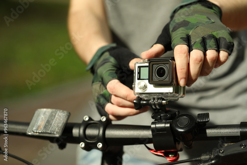 © New Africa, Obraz premium Man with modern action camera on bicycle outdoors, closeup